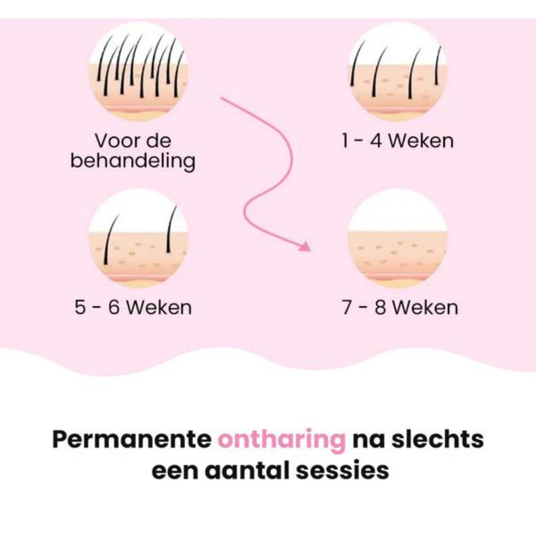 Het IPL ontharingsapparaat wordt gebruikt voor permanente ontharing en zorgt voor zichtbare haarreductie tot 6 maanden (als het behandelplan wordt gevolgd). Resultaten kunnen per persoon verschillen.