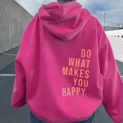Motiverend: "DO WHAT MAKES YOU HAPPY" op de rug dient als constante herinnering om vreugde na te streven in alles wat je doet.